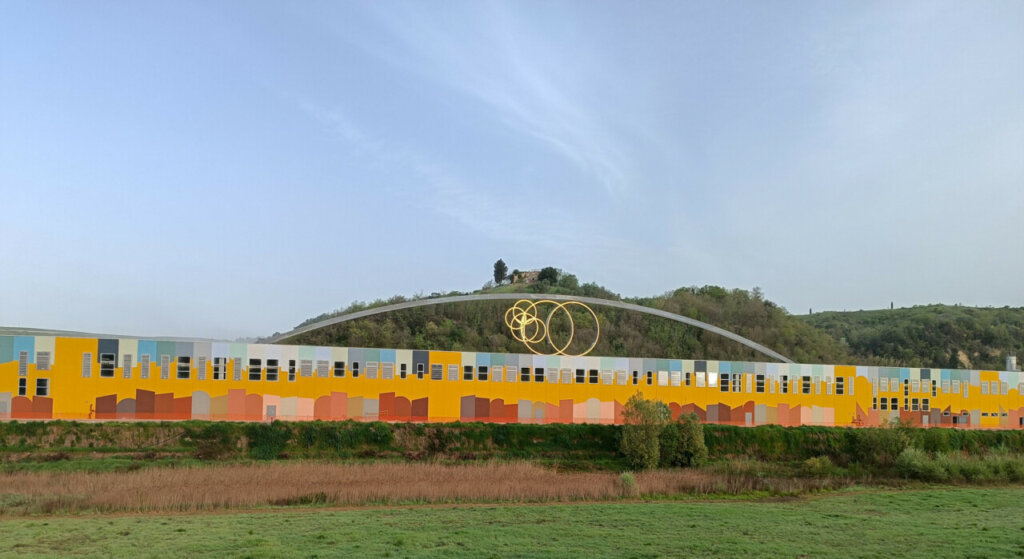 Con l’obiettivo di valorizzare l’inserimento del nuovo impianto nel bellissimo contesto delle colline dell’Alta Valdera, illustra Alia, si è scelto di utilizzare i capannoni come base per due opere d’arte di artisti di fama internazionale. Il capannone del compostaggio da 12.000 metri quadri ospita sulla copertura l’opera ‘Germoglio’ dell’artista Remo Salvadori: il fiore della vita, a cui si allude, è un simbolo del germoglio che nasce dal caos per poi creare una trasformazione. Sempre sul capannone del compostaggio, ma sulla facciata lunga oltre 200 metri, l’artista David Tremlet ha realizzato l’opera pittorica ‘Untitled’ partendo da una griglia geometrica e intersecata a una sequenza di forme astratte regolate e distribuite sulle superfici secondo criteri in cui predomina l’attenzione alla proporzione e ai rapporti spaziali che nascono dalla loro combinazione e assemblaggio. I colori selezionati dall’artista, l’ocra, il rosa, il marrone e le diverse gradazioni di grigio, rimandano alle colline circostanti, fattore determinante e fonte di ispirazione per il concepimento di una nuova opera da realizzarsi intorno a Peccioli.