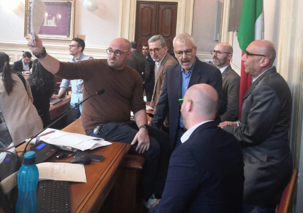 Con occupazione dell’aula di opposizione Lega Salvini con i consiglieri comunali Carlo Ghiozzi, capogruppo, e Marco Perini. Allontanati dall’aula, presidente del Consiglio Comunale Pietro Caruso, con la Polizia Municipale.
