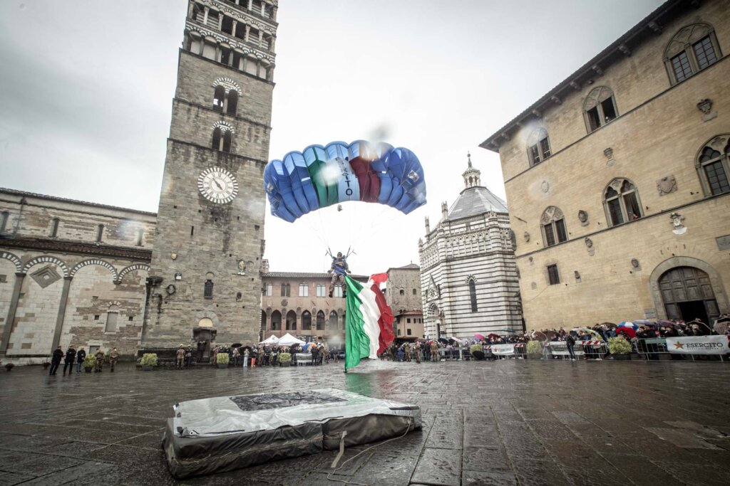 Una grande festa con lancio e atterraggio dei paracadutisti stamani in piazza Duomo a Pistoia nell’ambito della Festa del 183esimo Reggimento Nembo di stanza nella città toscana.